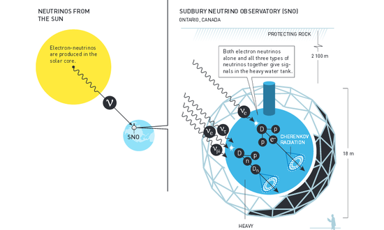 与此同时,在地球的另一端,加拿大萨德伯里微中子观测站的科学家们正在开展对来自太阳的中微子的研究工作。2001年,由阿瑟-麦克唐纳率领的研究组首次证明这些中微子同样存在类似的转变现象。