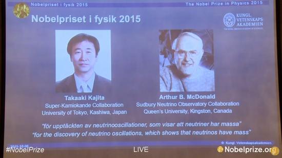 新浪科技讯 北京时间10月6日消息,瑞典皇家科学院刚刚宣布,日本科学家梶田隆章(Takaaki Kajita)和加拿大科学家阿瑟-麦克唐纳(Arthur B.McDonald)因为发现中微子震荡而获得2015年度诺贝尔物理学奖。