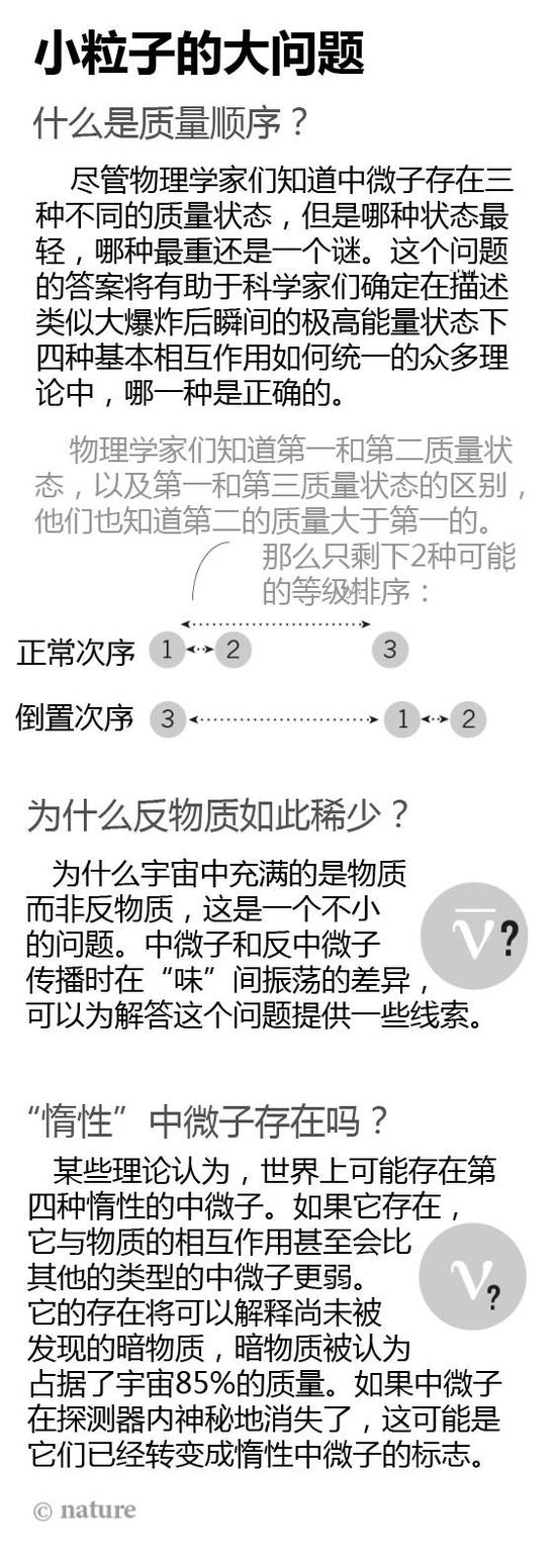 中微子是除光子外数量最为巨大的粒子,但它们与其他物质的相互作用很弱,地球表面每平方厘米的面积里,每秒钟有超过1000亿中微子穿过,却几乎不被人觉察。中微子曾经被认为是无质量的,而实际上,它们有一个极其微小的质量,并可以在传播过程中改变类型,这种匪夷所思、出人意料的性质令物理学家们十分费解。事实上,我们对于中微子的了解非常之少。“这是我们已知的宇宙最普遍存在的实物粒子,同时可能也是最神秘的。”奈杰尔·洛克耶(Nigel Lockyer)表示。奈杰尔·洛克耶是美国费米国家加速器实验室(也就是著名的费米实验室“Fermilab”)的主任。