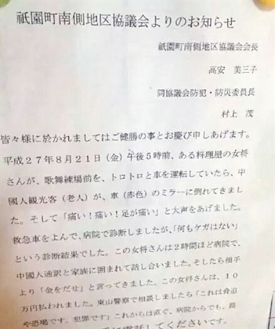 4日,网传一则日文版通告引起热议。其称2015年8月21日下午5点左右,京都一名餐厅女老板,驾车在祗园歌舞练习场前缓慢行驶时,一名中国老人突然倒在倒车镜前大叫“痛死了”,女老板随即叫救护车送老人入院,诊断结果“没有任何受伤”。女老板被老人家属及翻译在医院围了2小时,家属要求“付钱”。结果,女老板付了10万日元。当地警察在咨询时表示“这是胁迫与恐吓。这是犯罪”。通告称今后遇到类似情况请第一时间联系110。