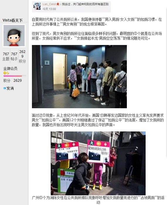 去年8月,网友陈先生就曾在网上发帖子,讲述了类似的经历。他的3岁女儿小便难忍,陈先生本来想带她进男厕所,但看见有两名男士,女儿又已经具备性别意识,最后选择进了女厕所,结果招来其他女士的指责。