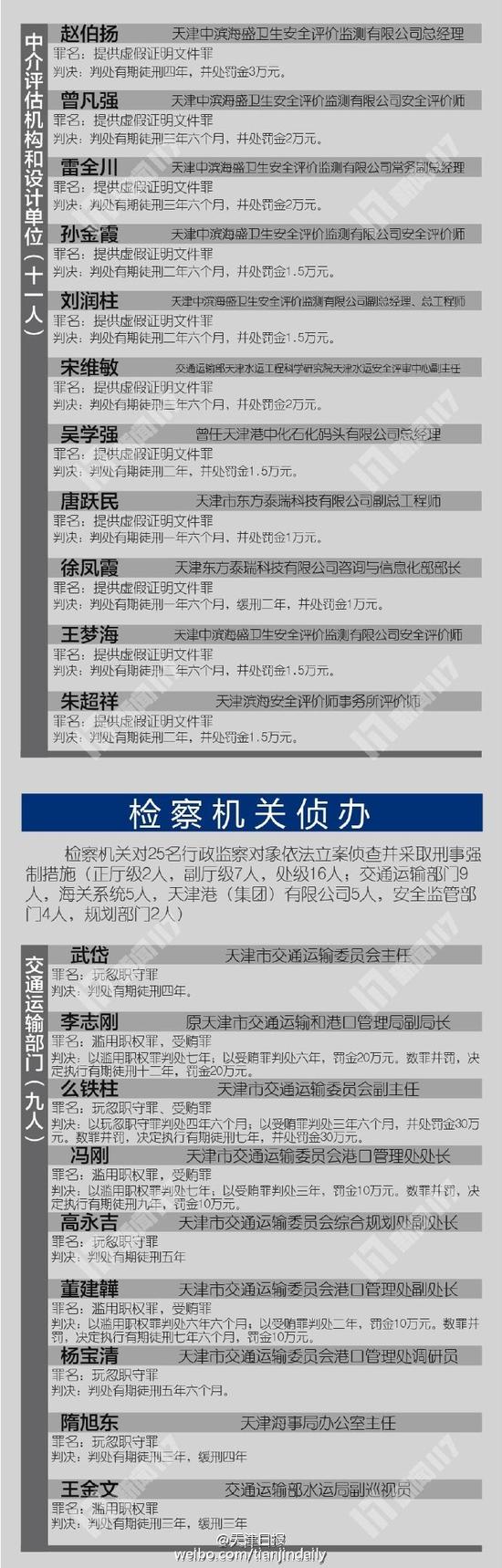 根据各被告人犯罪的事实、性质、情节和造成的社会危害后果以及在共同犯罪中的地位、作用,法院依法作出一审判决。瑞海公司董事长于学伟构成非 法储存危险物质罪、非法经营罪、危险物品肇事罪、行贿罪,予以数罪并罚,依法判处死刑缓期二年执行,并处罚金人民币70万元;瑞海公司副董事长董社轩、总 经理只峰等5人构成非法储存危险物质罪、非法经营罪、危险物品肇事罪,分别被判处无期徒刑到十五年有期徒刑不等的刑罚;瑞海公司其他7名直接责任人员分别 被判处十年到三年有期徒刑不等的刑罚。中滨安评公司犯提供虚假证明文件罪,依法判处罚金25万元:中滨安评公司董事长、总经理赵伯扬等11名直接责任人员 分别被判处四年到一年六个月不等的有期徒刑。天津市交通运输委员会主任武岱等25名国家机关工作人员分别被以玩忽职守罪或滥用职权罪判处三年到七年不等的 有期徒刑,其中李志刚等8人同时犯受贿罪,予以数罪并罚。