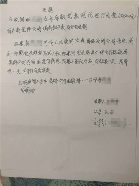 “北京时间”(微信号:btime007)发现,第二笔225000元分手费收据上写到,“分手费全部交清,包括青春损失费,身体伤害费。如果林某对我人身攻击,我会一如既往维护人权;如果不对我任何伤害,所涉及的关于两人视频资料,绝不流向社会;如视频资料流入社会,所付款全部退还;分手后各负其责。”