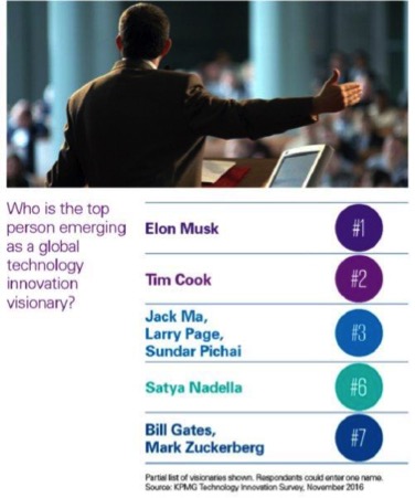 近日,国际著名会计师事务所毕马威对全球科技行业的高管进行了问卷调查,特斯拉CEO马斯克、苹果CEO库克和阿里巴巴董事局主席马云获选全球科技领袖前三名。