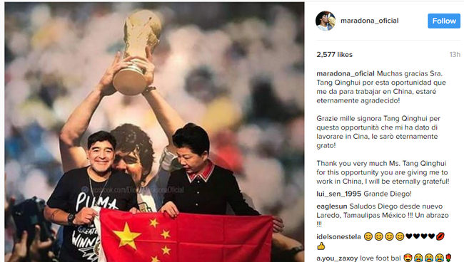 马拉多纳在自己的Instagram账号上写道:“非常感谢唐清慧女士给了我在中国工作的机会,我将永远感激。”