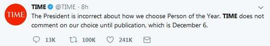 特朗普发文三小时后,《时代周刊》发文驳斥了特朗普的声明,该杂志在推特账号上表示:“总统对于我们评选年度人物或许有什么误解,我们杂志在12月6日公布评选结果前不予以评论。”