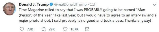 美国当地时间11月24日14时40分许,特朗普发布推文称:“《时代周刊》给我打电话说,我可能会被提名今年的‘年度人物’,就跟去年一样,我需要同意接受采访,还得拍一张海报大片。我跟他们说,‘可能’这事儿不太好,算了。但还是谢谢哈!”