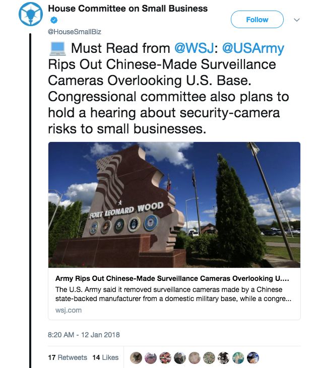 几天前,据《华尔街日报》1月12日报道,美国陆军说,已从一个美国国内军事基地拆走一家中国制造商制造的监控摄像头。与此同时,一个国会委员会计划本月举行听证会,研究小企业是否因使用这些设备而面临网络安全风险。