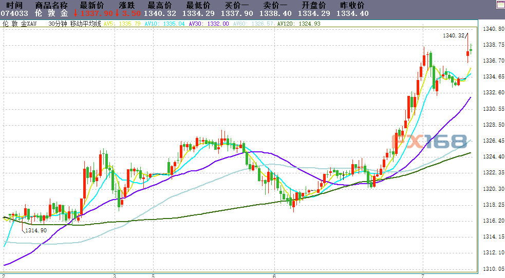 现货金则刷新2月26日以来新高,最高一度触及1340.32美元/盎司。