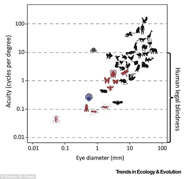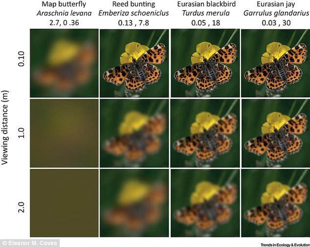 对人类而言,每度视觉不到10周的人会被视为法定意义上的盲人,而大多数昆虫的每度视觉只有1周。有人提出,蝴蝶的翅膀图案除了有吓退掠食者的作用外,还可能是吸引潜在配偶的方式。然而研究表明,这种说法可能并不准确。凯夫斯表示,她不认为蝴蝶能看到翅膀上的图案。