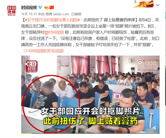对此,商丘市梁园区刘口镇政府回应称,8月4日,该镇召开脱贫攻坚加压促进会,会上该镇女干部杨某将脚搭在座位上。经核实,杨某在8月3日入村开展扶贫工作,不慎崴了脚踝,当天晚上贴敷膏药,加上开会当天会场有蚊子,脚部不适,忍不住挠了一下。网上舆论出现后,女干部十分后悔,向镇党委作出了检讨。