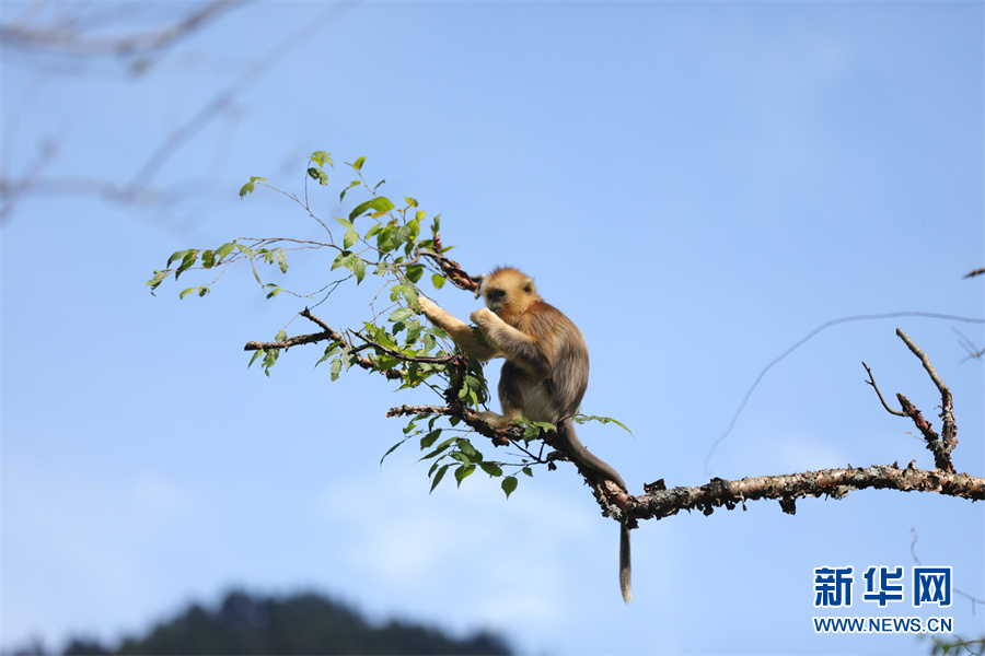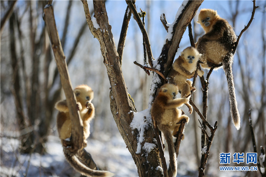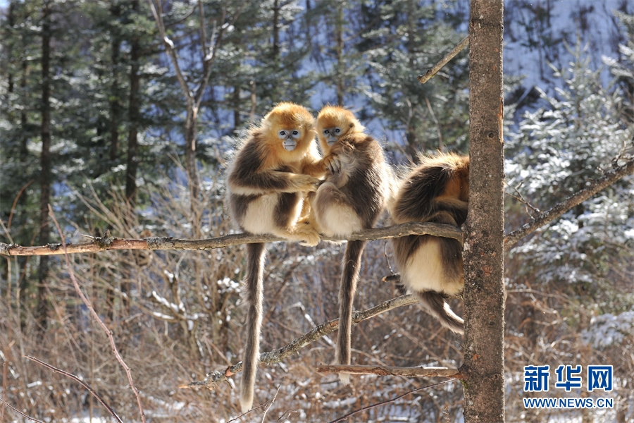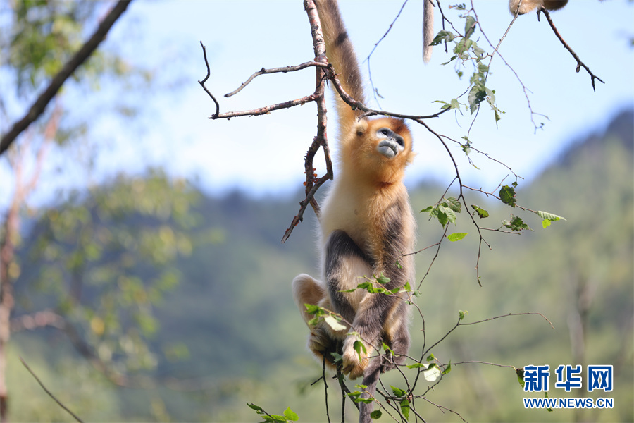 金丝猴在林间攀爬玩耍。新华网发 易先骏 摄