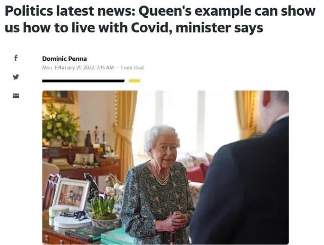 英国《每日电讯报》2月21日报道,在英国实施两年的防疫措施即将被完全取消之际,鲍里斯·约翰逊政府一名部长表示,英国女王是向民众展示如何“与新冠共存”的一个榜样。