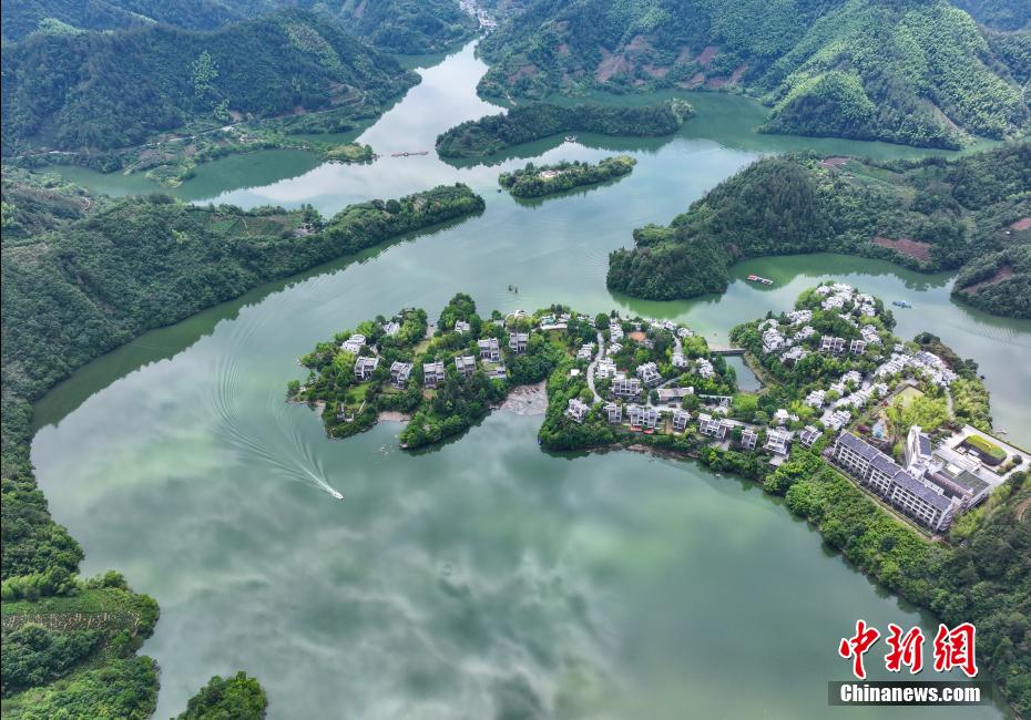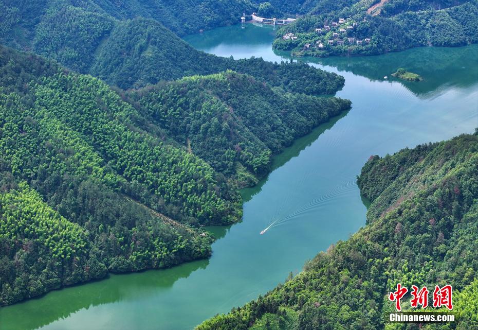 6月6日,仲夏时节,在安徽省黄山市徽州区洽舍乡,丰乐河碧波轻漾,两岸青山叠翠,环绕着鳞次栉比的徽派村落,绘就了一幅生机盎然的山水田园图卷。(无人机照片)施亚磊 摄