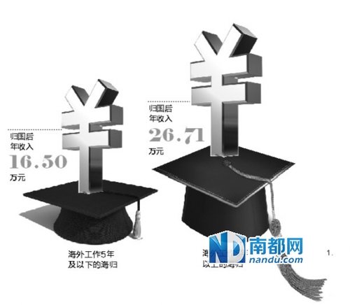 《2013海归就业力调查报告》显示,海归群体内部亦开始产生明显的收入落差。具有5年及以下海外工作经验的海归,归国后的年收入为16.50万元;而具有5年以上海外工作经验的海归,归国后年收入为26.71万元。同时,针对H R的问卷结果显示,用人单位在招聘时会将应聘者的专业技能作为优先考虑因素。