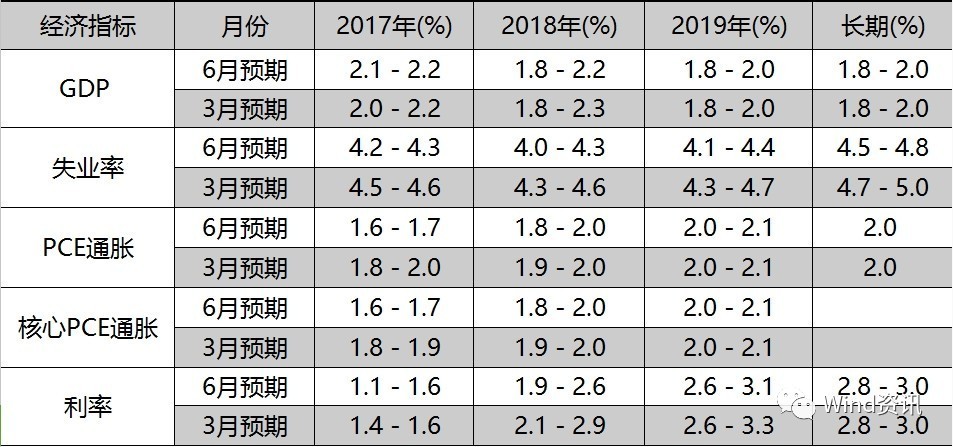 美联储2017年6月经济指标预期和3月预期对比(剔除3个最高和3个最低预估值):