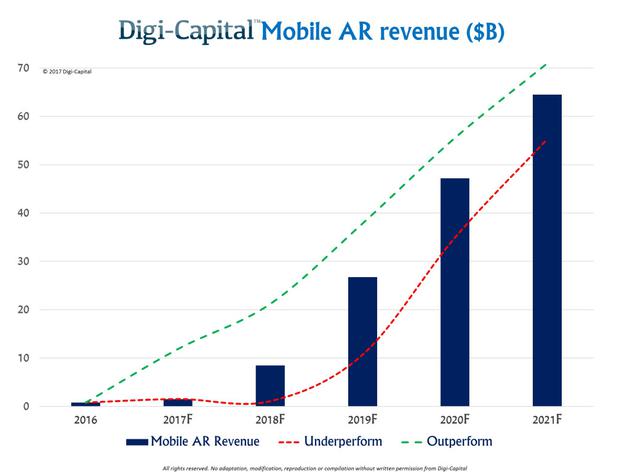 你或许已经注意到,这里并未列出硬件,这么做其实是有原因的。在苹果、三星或华为推出移动AR硬件之前,我们无法知道他们的AR手机是否会缩短手机换机周期,从而刺激销量,或者通过溢价来提升单位营收。在移动AR硬件的可靠数据发布前,对硬件的营收持有中性立场是最保守的方法。