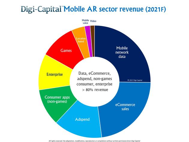最后,基于特定地点的应用(例如主题公园)、移动网络语音和视频也将利用移动AR获取不菲的营收,但规模相对较小。
