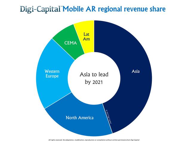 综合我们的预测,亚洲(中国、日本、韩国等)可以拿下不到一半的全球移动AR营收、北美和西欧分别拿下约五分之一。所以,虽然虚拟现实从美国起步,逐步转向亚洲,但移动AR的表现似乎会更加平衡,腾讯,阿里巴巴、百度将与Facebook和其他企业共同登上国际舞台。